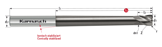 Твёрдосплавная концевая фреза с угловым радиусом и конической шейкой для обработки штампов и пресс-форм, особо длинная